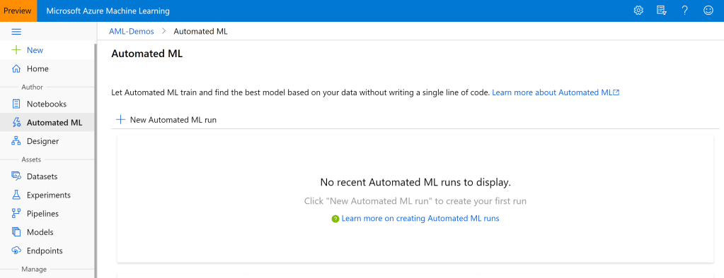 ml.azure.com web interface is the one stop portal for accessing all the tools and services related to machine learning on Azure. You have to create a new Automated ML run by selecting Automated ML on the Author section of the left pane.