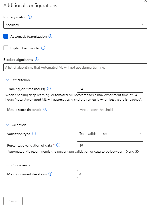 In the settings of the run, you can specify the evaluation metrics, any algorithms that you are don’t want to use, validation type, exit criterion etc. for the experiment. If you wish to select only a specific set of features in the provided dataset you can configure that through the settings.
