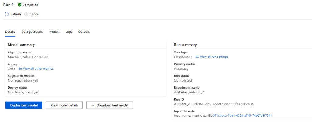 When the run is completed AzureML provides a summary of the run by indicating the best performing algorithm. You can directly deploy or download the best performing model as a .pkl file from the portal.